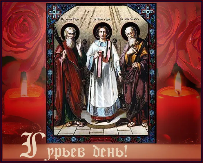 Моли Бога о нас, святые мученики Гурий, Самон и Авив, чтобы Господь даровал нам мир, благоденствие, любовь и согласие. Открытки на Гурьев день!