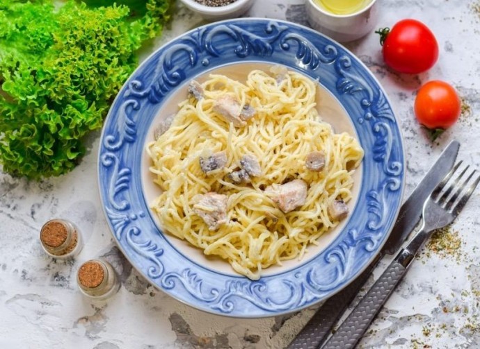 Паста со сливочным соусом и филе индейки Ингредиенты:Спагетти — 150 гФиле индейки — 250 г