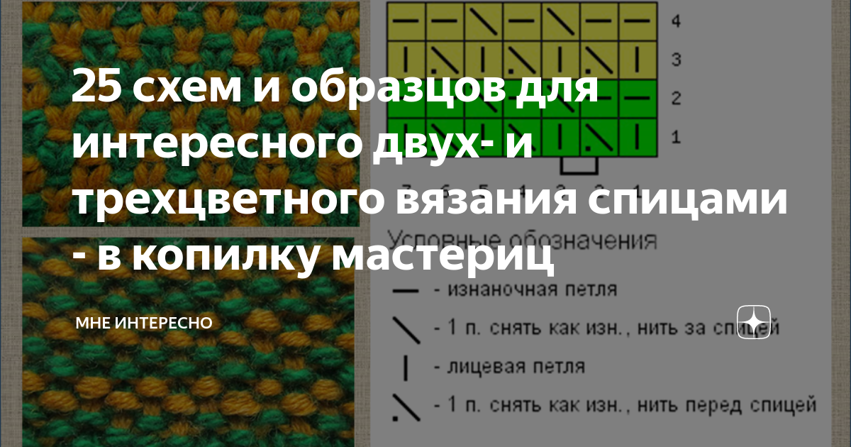 25 схем и образцов для интересного двух- и трехцветного вязания спицами - в копилку мастериц Статья автора «МНЕ ИНТЕРЕСНО - жаккардовое вязание» в Дзене ✍: Сегодня у меня 25 образцов и схем для вязания двух и более цветного полотна. Подойдет и для одежды, и для палантина, и много еще куда.