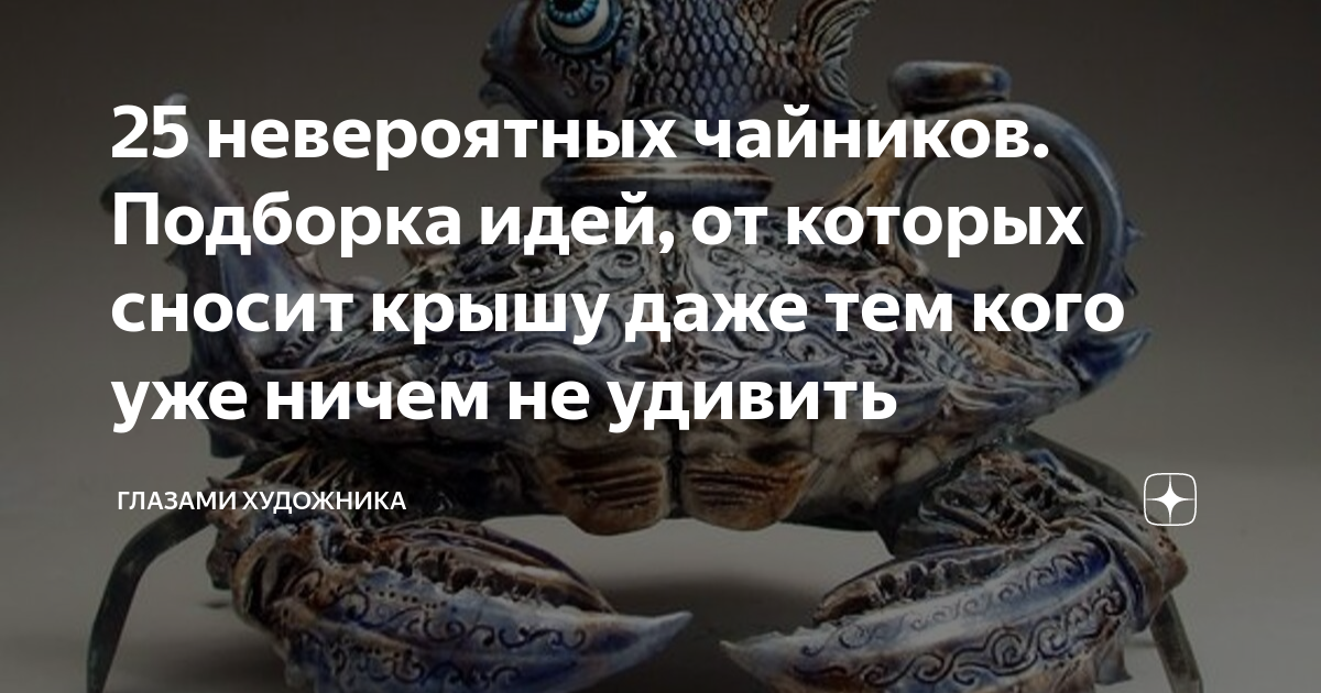 25 невероятных чайников. Подборка идей, от которых сносит крышу даже тем кого уже ничем не удивить Статья автора «Глазами художника» в Дзене ✍: Продолжая тему чайников представляю вам ряд изделий, поразивших моё воображение экзотическими формами и неординарностью идей.