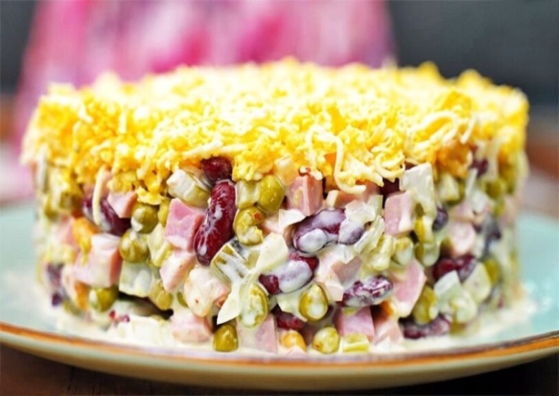 Салат «Робин-Бобин» Ингредиенты: - Ветчина (или варено-копченое мясо) – 250 г - Фасоль (консервированная) – 200 г - Горошек (консервированный) – 250 г - Лук – 1 шт. - Огурец (маринованный) – 150 г - Яйца (вареные) – 3 шт. - Арахис (соленый) – 50 г - Майонез – по вкусу Для маринования лука: - Уксус 6% – 1 ст. л. - Вода – 2 ст. л. - Сахар – 1 ч. л.