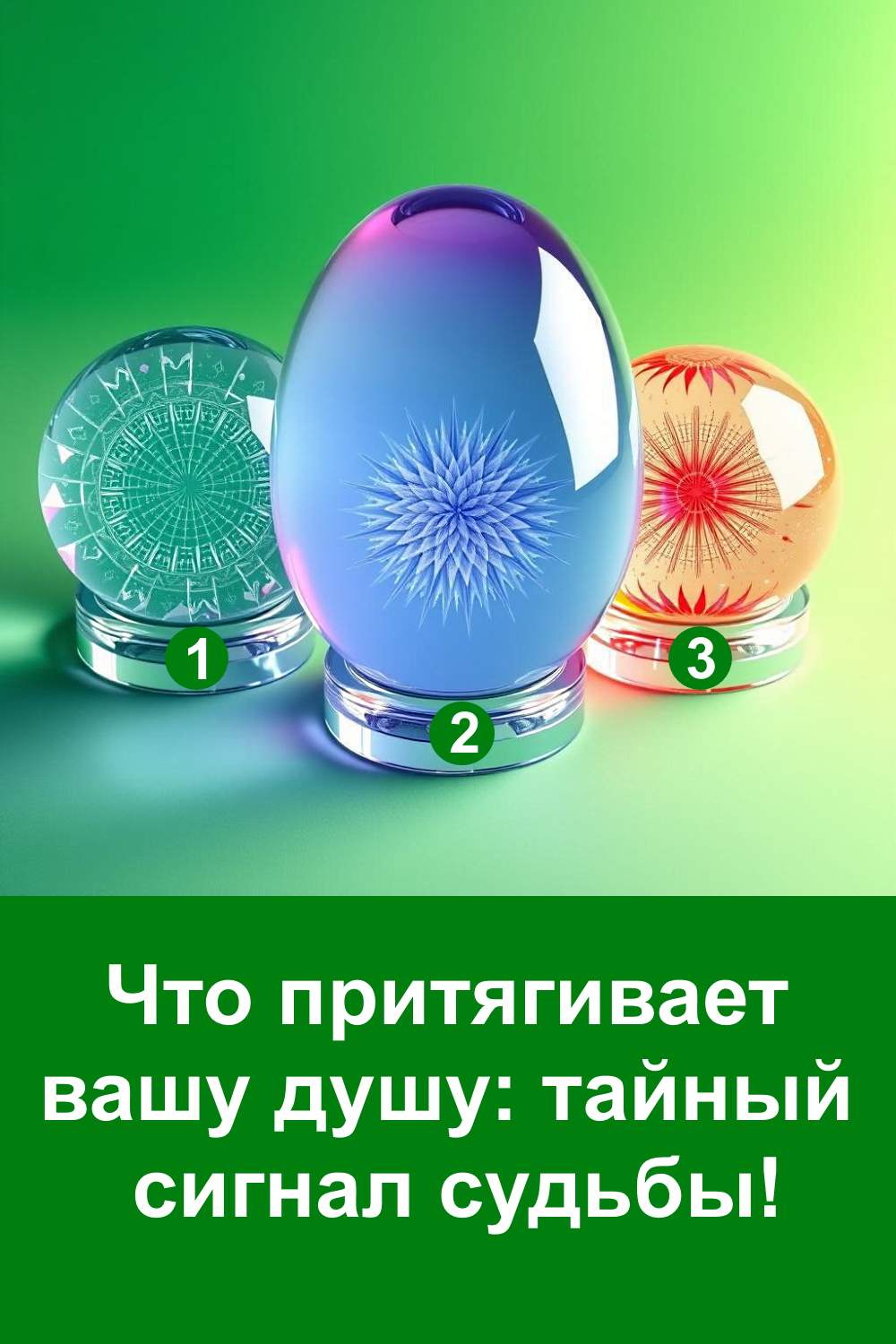 Этот простой тест помогает понять, какой сигнал судьбы откликается вашей душе. Перед вами три шара, каждый из которых несёт свою энергию и смысл. Интуитивный выбор показывает ваше внутреннее состояние, скрытые чувства и то направление, которое сейчас ближе вашему сердцу. Такой тест даёт возможность мягко взглянуть на себя со стороны и заметить важные подсказки, которые появляются на вашем пути.