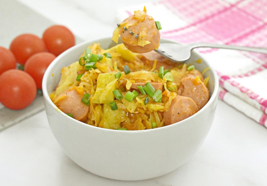 - Капусту, тушёную с кабачками и сосисками, раскладываем по тарелкам и в горячем виде подаём сочное, аппетитное, вкусное блюдо к столу.