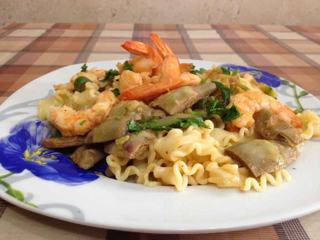 - Тальолини с артишоками и креветками готовы к подаче!