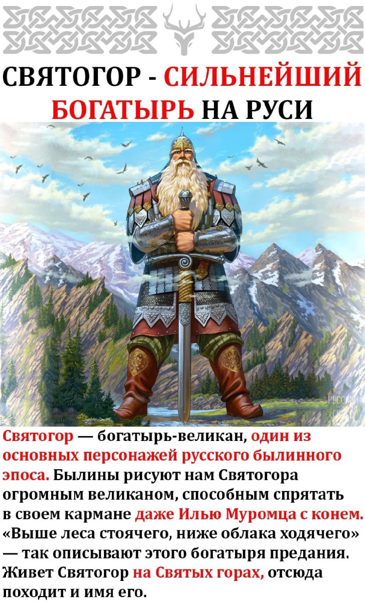 Святого́р — в древнерусской мифологии богатырь-великан. Относится к наиболее древним героям русского былинного эпоса, находящегося вне киевского и новгородского циклов и лишь отчасти соприкасающегося с первым в былинах о встрече Святогора с Ильёй Муромцем. День памяти богатыря Святогора отмечается в России 3 декабря. Открытки на День памяти богатыря Святогора.