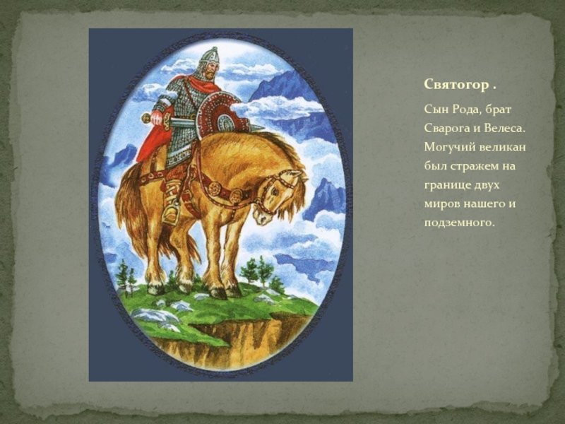 Святого́р — в древнерусской мифологии богатырь-великан. Относится к наиболее древним героям русского былинного эпоса, находящегося вне киевского и новгородского циклов и лишь отчасти соприкасающегося с первым в былинах о встрече Святогора с Ильёй Муромцем. День памяти богатыря Святогора отмечается в России 3 декабря.Открытки на День памяти богатыря Святогора.