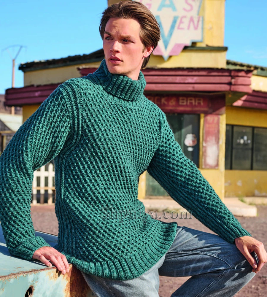 Мужской пуловер с воротником гольф и узором со снятыми петлями — Shpulya.com - схемы с описанием для вязания спицами и крючком