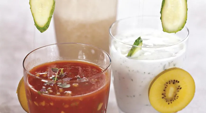 - РЕЦЕПТ ПРИГОТОВЛЕНИЯ Негаснущий экран Нажмите, чтобы экран не гас, пока вы готовите. Экран вернется в привычный режим, когда вы покинете страницу или отключите функцию Шаг 1 Приготовить томатный коктейль. Укроп вымыть, измельчить. Огурцы очистить, нарезать крупными кусками. Измельчить в блендере укроп с огурцами. Влить сок, поперчить, перемешать. Разлить по стаканам.Шаг 2 Приготовить йогуртовый коктейль. Взбить половину кефира, йогурт, эстрагон и лимонный сок. Добавить оставшийся кефир. Посолить, поперчить. Перемешать и разлить по стаканам.Шаг 3 Приготовить фруктовый коктейль. Бананы и киви очистить. Взбить вместе с ананасом. Добавить мед и лимонный сок . Развести водой и разлить по стаканам.