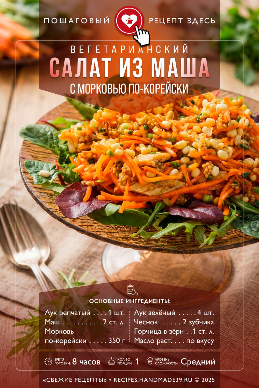 Необычный салат из пророщенного маша и корейской моркови 🥗. Ищете новый вкус? Попробуйте этот яркий вегетарианский салат! Здесь идеально сочетаются дерзкая острота моркови по-корейски и сдержанная сытность пророщенного маша. Это блюдо не только радует глаз, но и приносит огромную пользу организму. Готовится элементарно: смешайте ингредиенты, добавьте любимую зелень и специи. Единственный секрет — позаботиться о маше заранее (проращиваем из расчета 50 г сухого продукта на порцию).