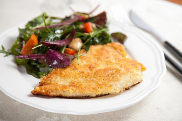 Куриное филе в сырной панировке Ингредиенты: Филе куриное — 1 шт.Яйцо — 1 шт. Сухари панировочные — 0,5 стак. Пармезан тертый (или другой твердый сыр) — 0,5 стак. Соль — по вкусу Перец — по вкусу Масло растительное — для жаркиПриготовление:1....