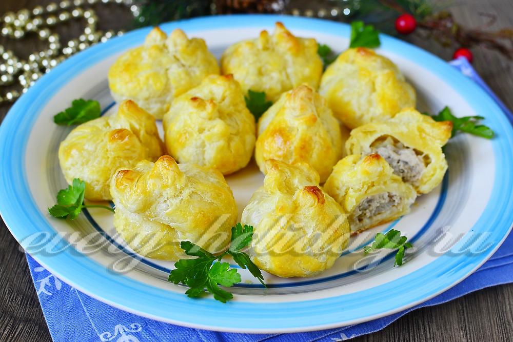 Мешочки из слоеного теста с фаршем Оригинальная и сытная закуска, приготовленная из слоеного теста и мясного фарша с луком, яйцом и перцем. Приготовить такие мешочки с фаршем можно к обеду или ужину, и на праздничном столе они будут смотреться красиво и к месту.
