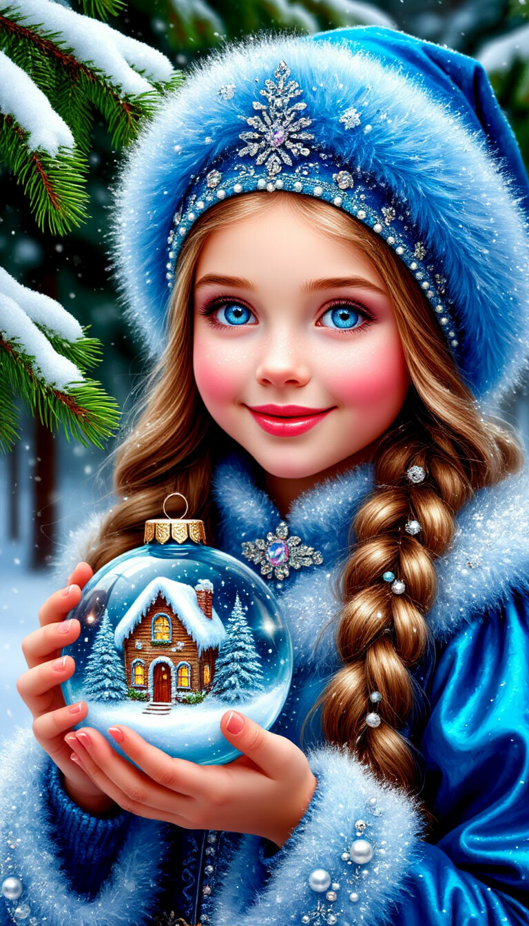 Зима, снег, крупным планом красивое лицо Снегурочки, огромные, добрые, голубые глаза девочки, румянец, милая улыбка, красивые длинные волосы, голубая дублëнка, расшитая жемчугом и голубая шапочка из пушистого меха, боке, самоцветы, стразы, огоньки, волшебный мир, сказка. Снегурочка держит в руках большой стеклянный шар с игрушечным новогодним домиком и черепичной крышей внутри. Стиль новогодней открытки...