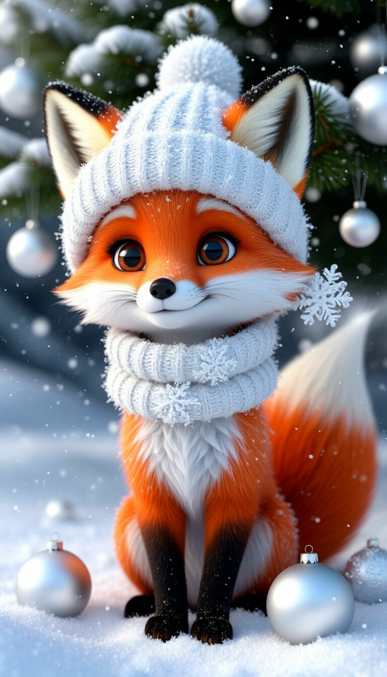 Белоснежная зима. Много снега. 3d снежинки. . Девочка-лиса. В белоснежной шапочке и с мультяшным Гарфиком. Белое-белое. Белое на белом. Белые снежинки. Белоснежная елка украшена жемчужными елочными шарами. мячи.. Милый.. Ulla HD. 16-каратный 3D-эффект