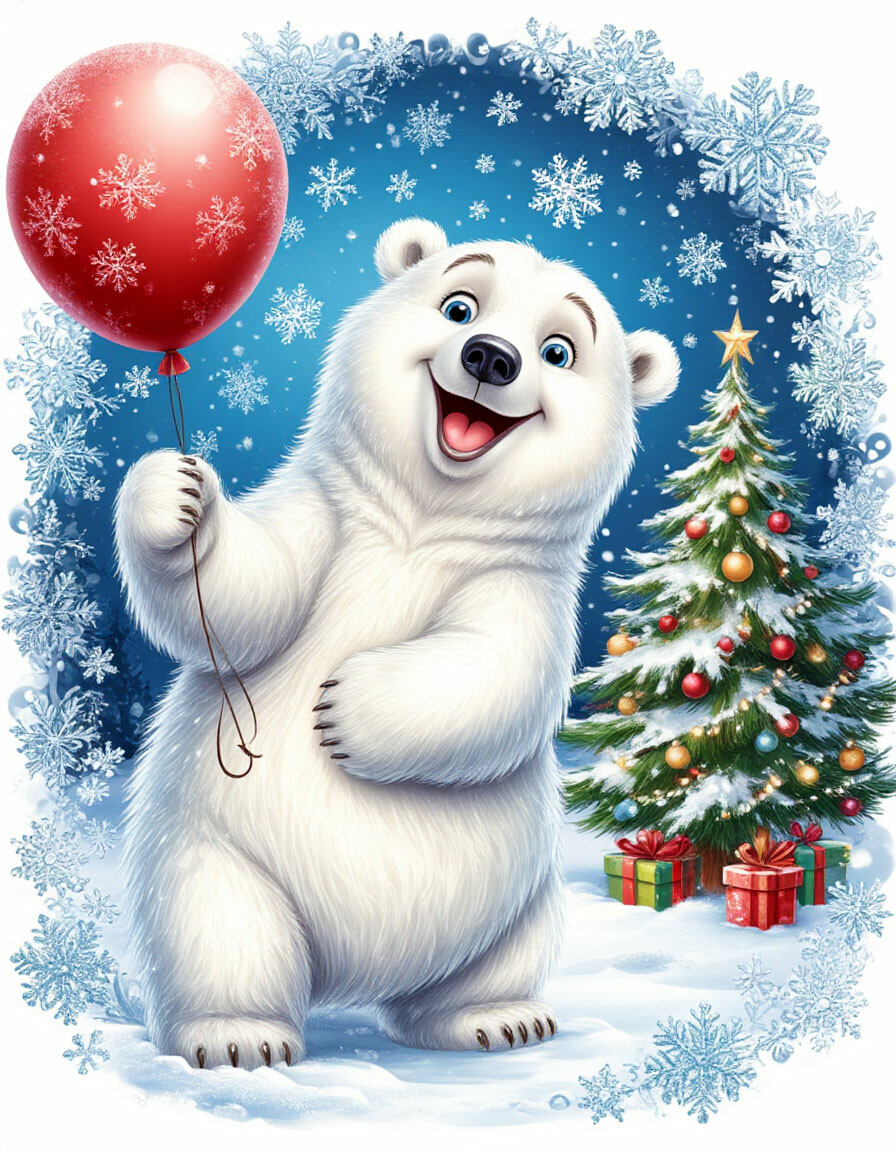 на белом фоне, филигрань, дисней, пушистый улыбающийся белый медвежонок, шарчик, высунувший язык, смотрящий на снежинки, рождественская елка возле дома, снежинки, мороз, иллюстрации, фэнтези, сказки, стиль гонда, пушистый узор