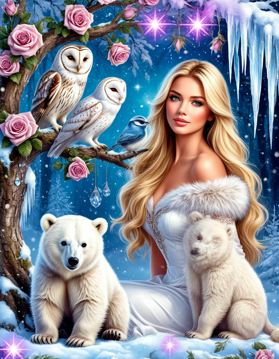 Женщина с длинными светлыми волосами , одетая в белое платье с меховой отделкой. На ее плече сидит сова. Слева от женщины находится украшенное розами дерево, на ветке которого сидит маленькая голубая птичка На переднем плане изображены два белых медвежонка, один из которых сидит, а другой стоит на задних лапах. Фон выполнен в холодных ...
