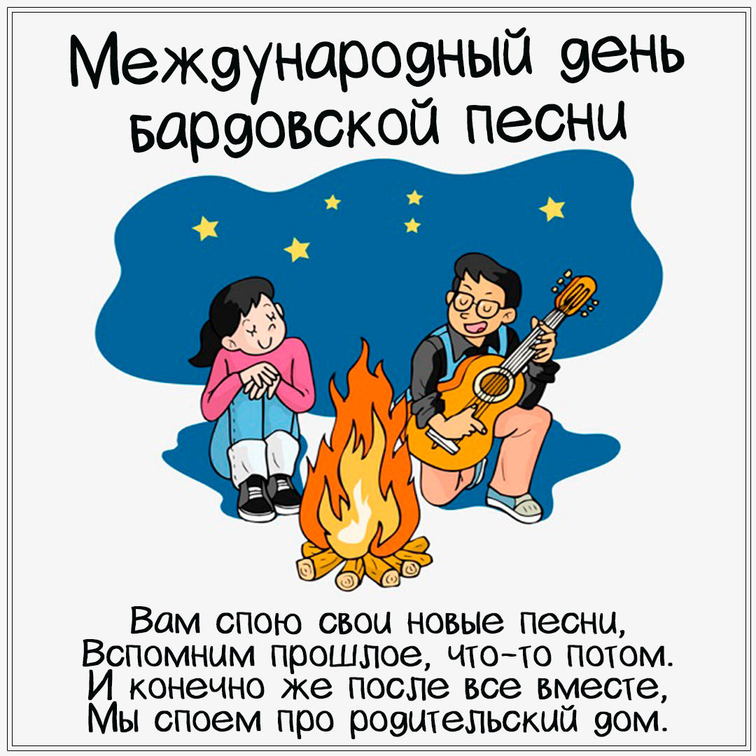 Дорогие друзья, барды, слушатели! Поздравляю с нашим днем! Желаю неиссякаемого вдохновения, душевных посиделок у костра, верных друзей и чтобы каждая песня находила отклик в сердцах. Открытки на День бардовской песни!