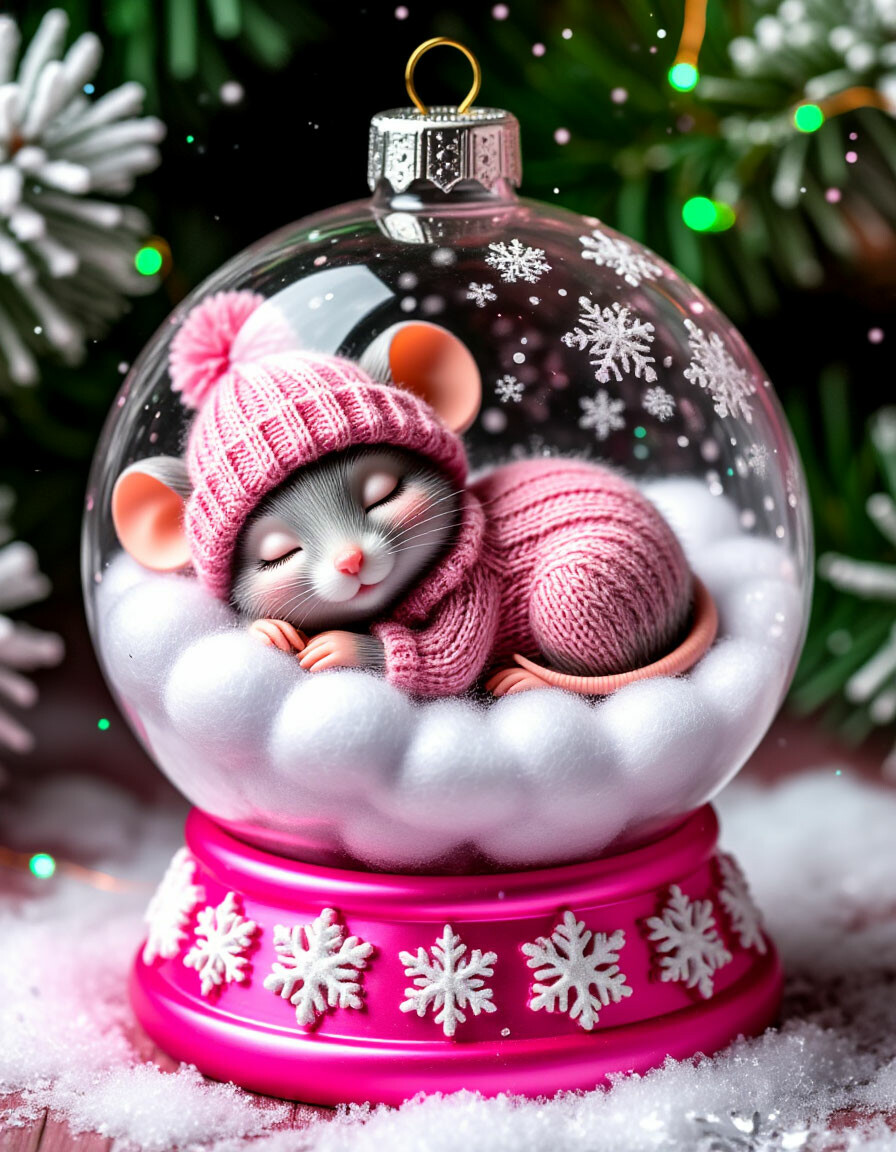 «A Christmas tree toy in the form of a transparent ball with a sleeping mouse inside. The mouse is wearing a …» — картинка создана в Шедевруме A Christmas tree toy in the form of a transparent ball with a sleeping mouse inside. The mouse is wearing a pink knitted hat and blouse. She's lying on a fluffy white cloud. The mouse's eyes are closed, and it looks very peaceful. The ball is placed on a pink stand decorated with white snowflakes. The stand is covered with a layer o...