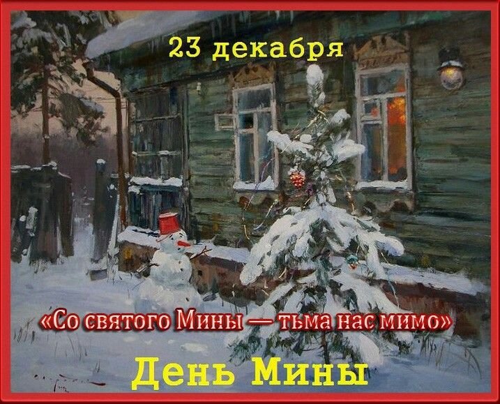 Народный праздник День Мины отмечается 23 декабря (по старому стилю – 10 декабря). В церковном календаре это дата почтения памяти Мины Красноречивого. Открытки на День Мины!