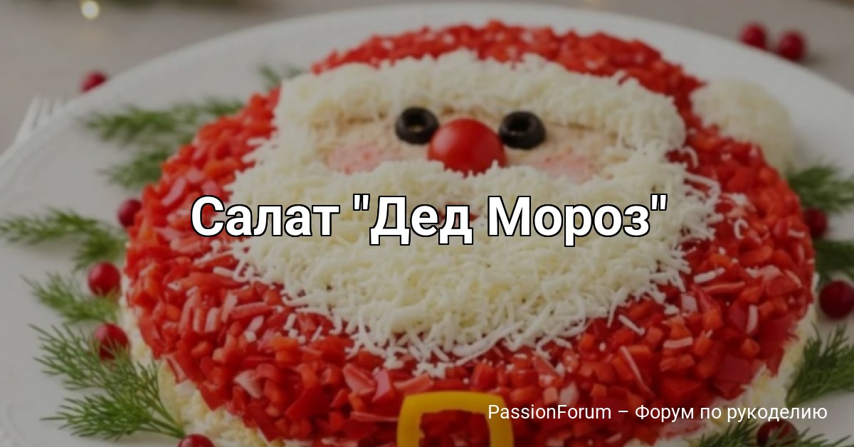 Салат "Дед Мороз" Салат \"Дед Мороз\" - настоящий щедевр для праздничного стола!Ингредиенты (слои):Картофель (отварной, тертый)Курица (отварная, нарезанная)Желтки (отварные, тертые)Сыр (твердый, тертый)(Каждый слой промазывается майонезом)Ингредиенты (украшение):Красный болгарский перец (мелко нарезанный)...