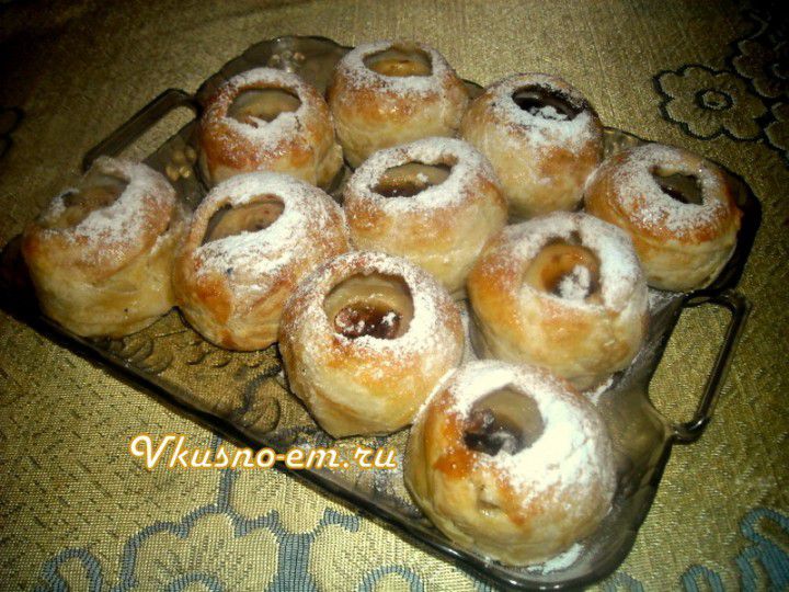 Яблоки "в платочках" Яблоки, сахар, ванилин, корица, половинки грецких орехов, изюм. Тесто: 400 г муки, 250 г маргарина или масла, 1 яйцо, ½ ст. воды, 1/3 ч.л. соды гашеной уксусом, 2 г соли. Белок 1 яйца для смазки.