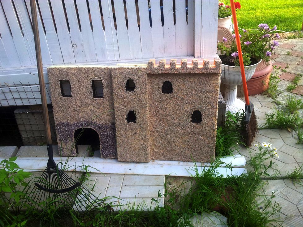 Прокрашиваем зубцы краской в тон штукатурки. После того, как краска высохнет, покрываем лицевую сторону стены декоративной штукатуркой (зубцы штукатуркой можно не покрывать). Затем посыпаем часть стены вокруг ворот мелкой каменной крошкой и, похлопывая, притапливаем крошку в штукатурку. Крошкой можно посыпать и вторую половину стены. После чего оставляем всю конструкцию сохнуть на пару дней, а сами пока займемся изготовлением третьей стены.