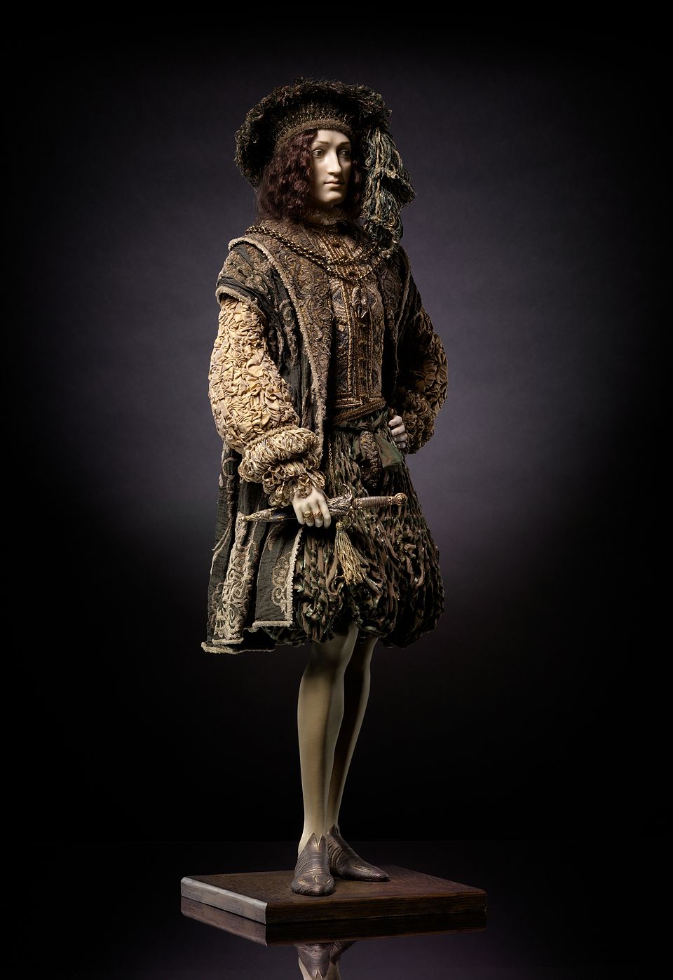 Матиас.Северное Возрождение первой трети 16 века. Фарфор бисквит. Натуральный шелк, шелковый панбархат, тафта шанжан, вышитая металлическими нитями. Натуральная кожа. Кинжал и орден Золотого Руна изготовлены из фарфора, украшены шликерной росписью и позолочены. Кольца из цветных металлов с полудрагоценными камнями изготовлены по специальному заказу. Волосы – натуральный мохер. Ручная роспись. 72,5 см.Авторская и фантазийная кукла Александры Кукиновой.