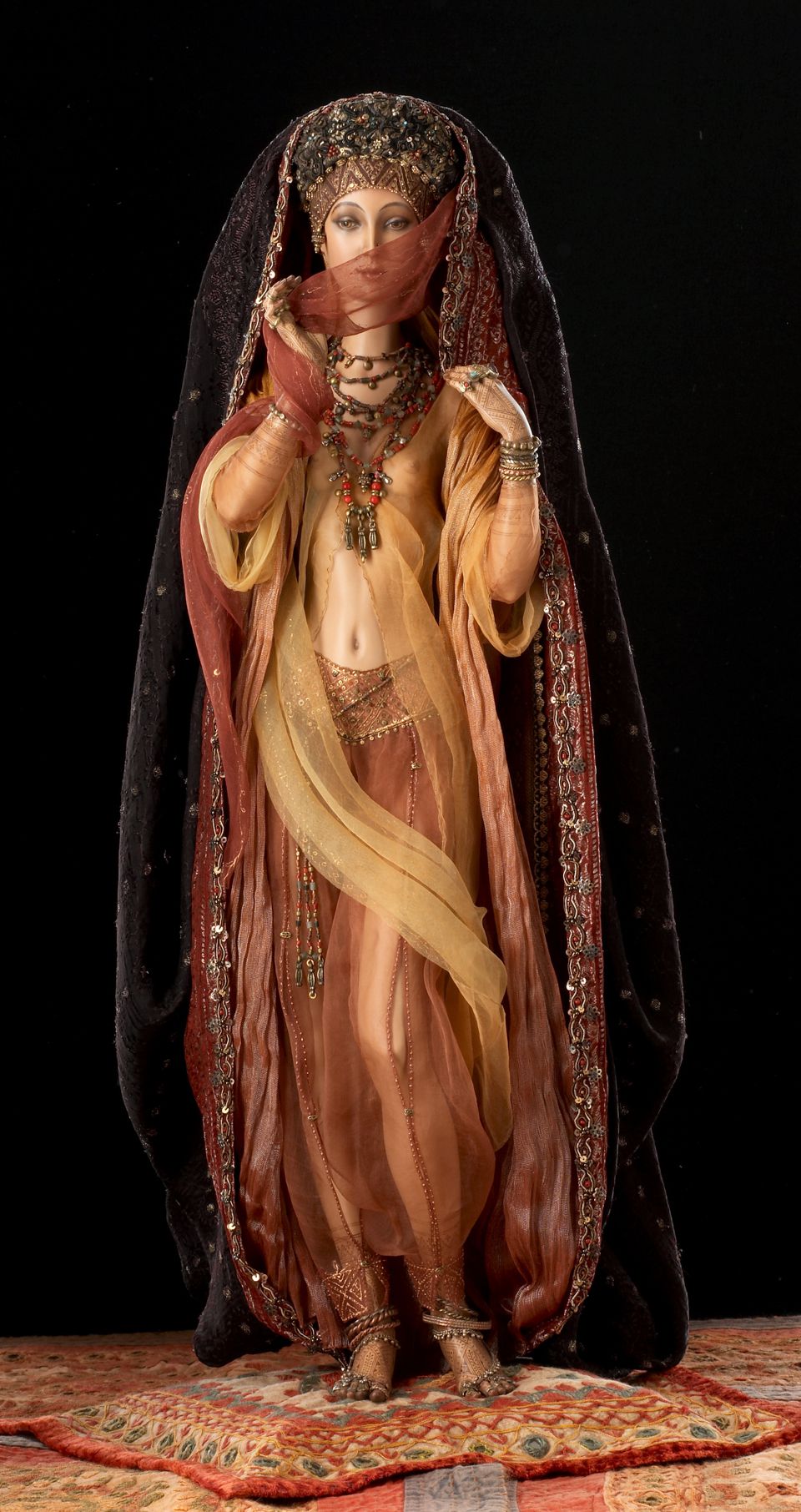 Ювелирные украшения изготовлены по специальному заказу с использованием антикварных восточных элементов и полудрагоценных камней. Татуировка на руках и ногах копирует узоры, выполняемые в соответствии со старинными восточными традициями росписи тела хной. Ручная роспись, 62см. Авторская и фантазийная кукла Александры Кукиновой.