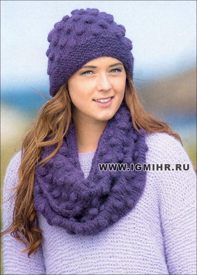 Теплая фиолетовая шапочка и снуд с шишечками, от финских дизайнеров. Спицы.
