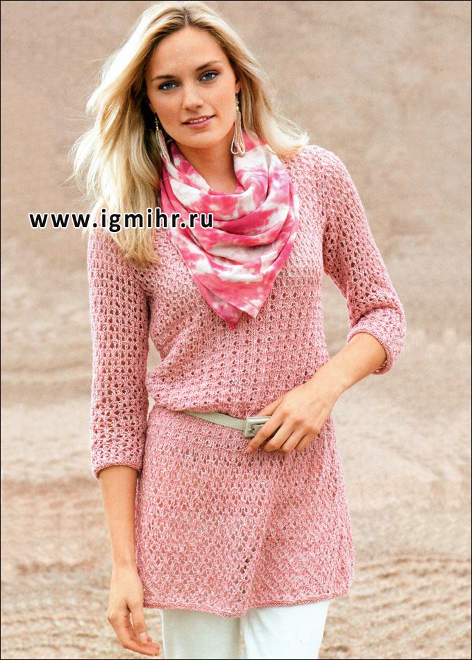 Меланжевая розовая туника из ажурных узоров. Спицы.