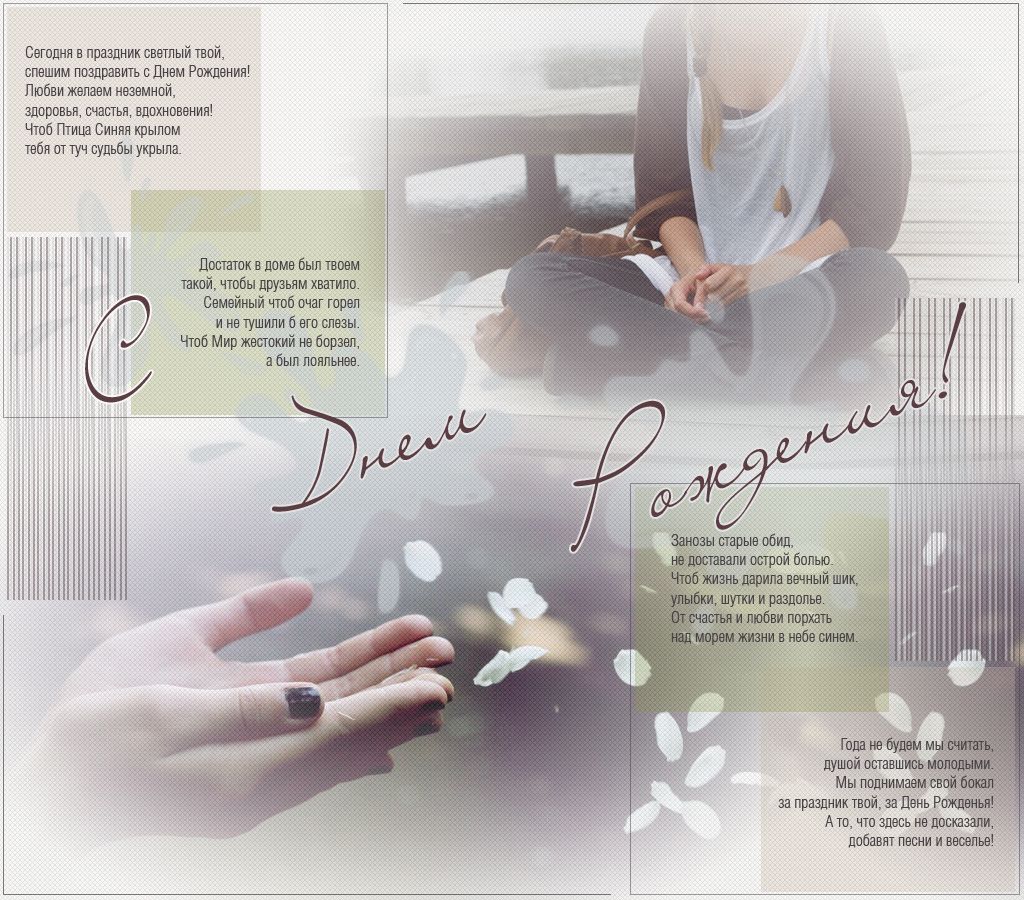 Моя подруга - озорница. Хоть ей уже не десять лет, Она по-детски веселится И дарит близким добрый свет! Когда в снегу луч солнца тлеет Игривым отсветом блесны, Тогда душа от счастья млеет, Попавшись на крючок весны. Пред тем, как к цели устремиться, Желаю взвешивать вперед: Когда мечта осуществится, Какую цену жизнь возьмет. От всей души тебе желаю Не изменять своей судьбе! Чтоб в этот день и впредь удача Звездой в ладонь легла тебе!