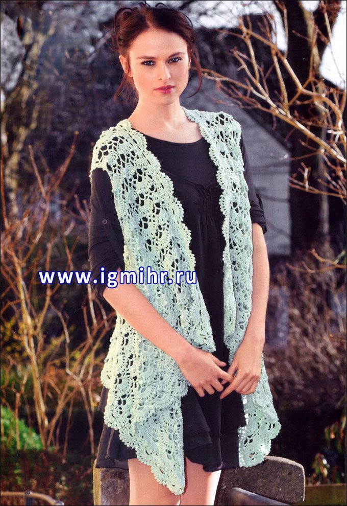 Романтичный светло-зеленый жилет с красивым ажурным узором. Крючок