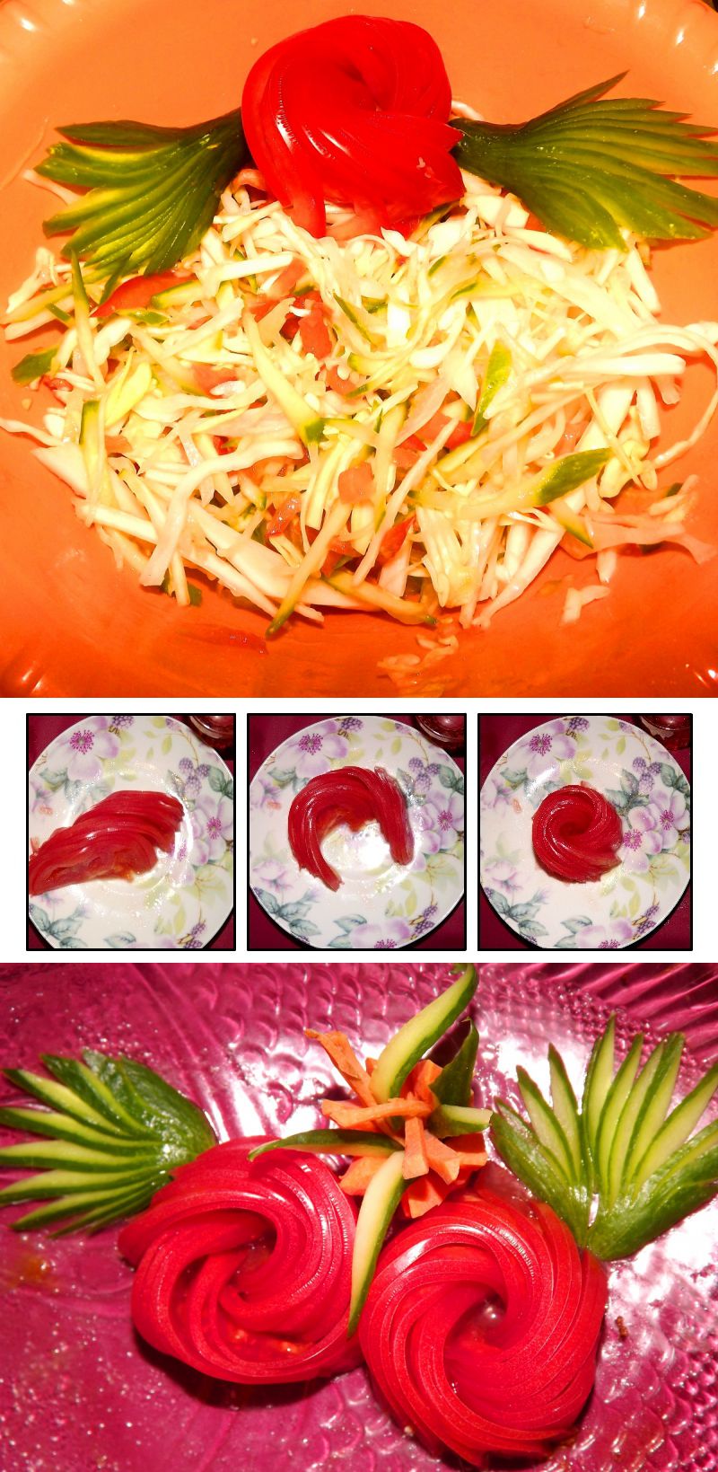 Как сделать розочку из помидора для украшения салата? Нет ни чего проще, посмотрите мой не большой, но полезный мастер — класс… Острым ножом нарезаем тоненько помидор, раздвигаем, заворачиваем… вот и розочка готова .
