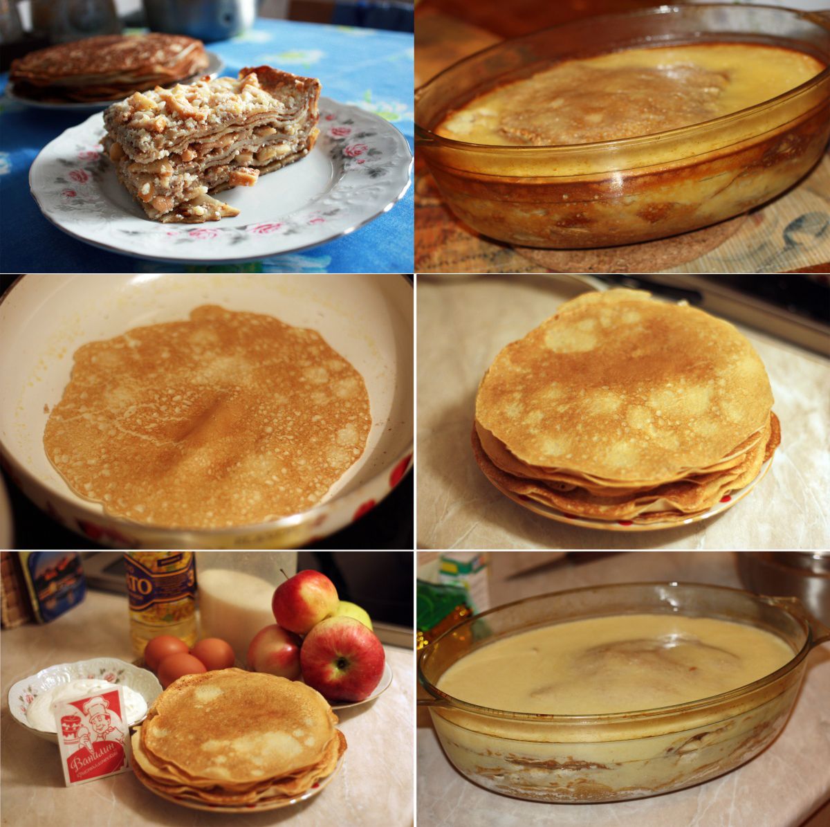 Я пеку обычные блинчики из 500-700 мл. молока, 2-х яиц,1 ст. л. сахара, щепотки соли, 1/2 ч. л. соды, муки и 1 ст. л. раст. масла, на сухой сковороде. В глубокую форму складываю их друг на друга, пересыпая начинкой из яблок, изюма и те же бананы иногда добавляю.) Ножом прокалываю пирог насквозь в некоторых местах и сверху выливаю заливку из сметаны, яиц и сахара. Ну, собственно, все легко и просто)