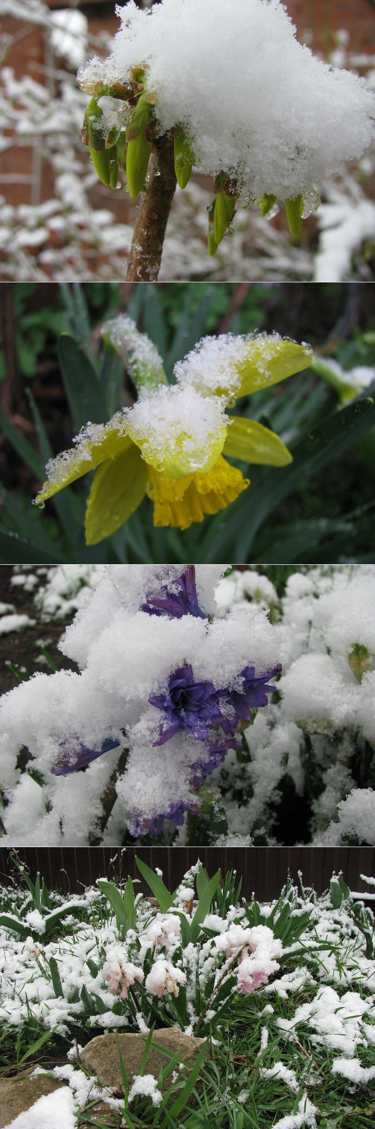 Цветы под снегом.Похоже, это становится традицией: в конце марта зима посылает свой прощальный привет. В прошлом году это случилось 27 марта, тогда прошел ледяной дождь.А в этом году сегодня, 29 марта, у нас была настоящая метель! А ведь утро было по-настоящему весенним: щебетали птицы, летали пчелы, солнышко пригревало (+7), цветы красовались на клумбах, раскрывая бутоны прямо на глазах.