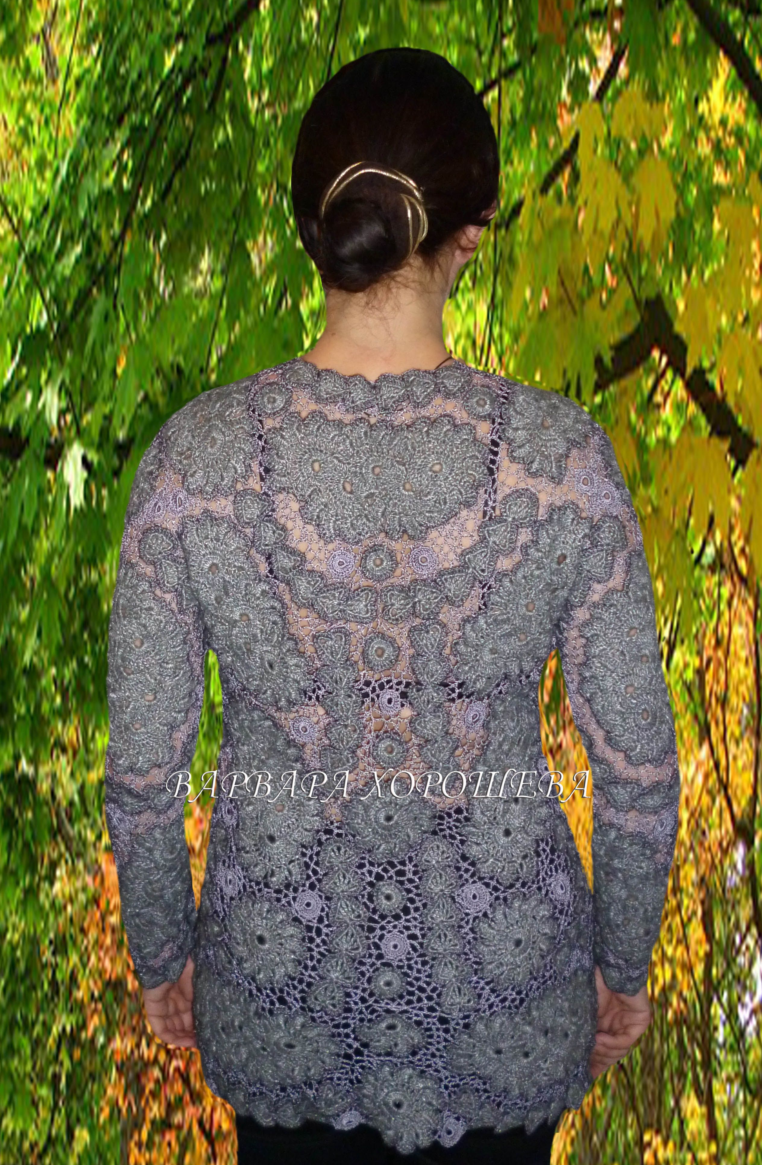 Авторская модель. Выполнена в технике ирландского кружева с применением нерегулярной сетки элементов ленточного кружева. Использовано 2 вида пряжи – полушерстяная и шелковая, итальянского производства – близких тонов. Модель приталена по фигуре. В ней Вы будете выглядеть шикарно и неповторимо.