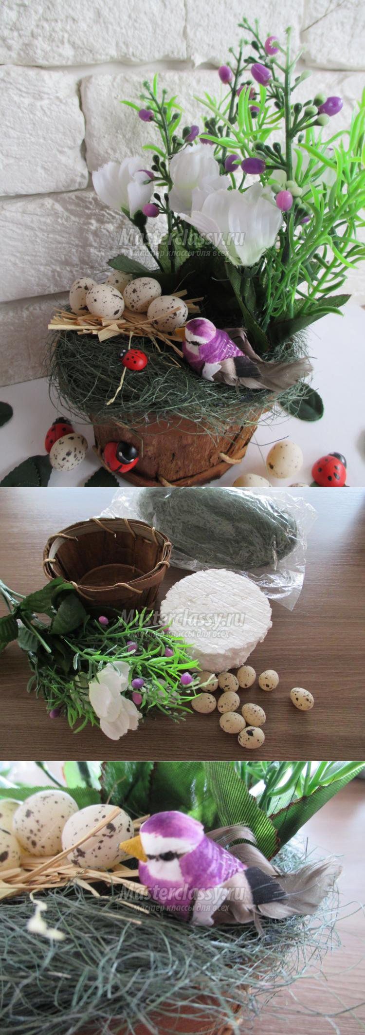 * ПАСХАЛЬНАЯ композиция, которая украсит дом в такой Светлый Праздник ! Сделать её не сложно, да и времени займёт немного. *** Для изготовления нам понадобятся: деревянный горшочек, пенопласт, декоративные иск/цветы, листики и травка, клеевой пистолет, стержень клея, сизаль тёмно-зелёного цвета, декоративные - птичка, яйца и божьи коровки, рафия бежевого цвета (солома), ножницы, кусачки.