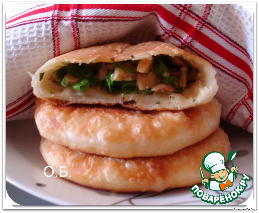 - Замесили тесто (густое, не должно липнуть к рукам). Разделили на одинаковые шарики. Раскатать каждый шарик, укладываем начинку (любая по вашему вкусу, не обязательно постная!) У меня грибы с луком. Соединили края, раскатали.
