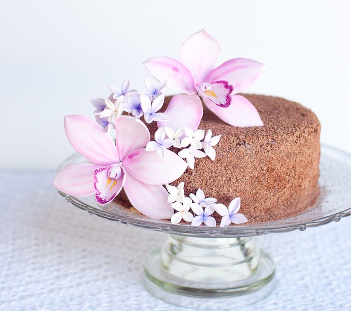 Орхидея из сахарной мастики для шоколадного торта с кокосовым кремом.