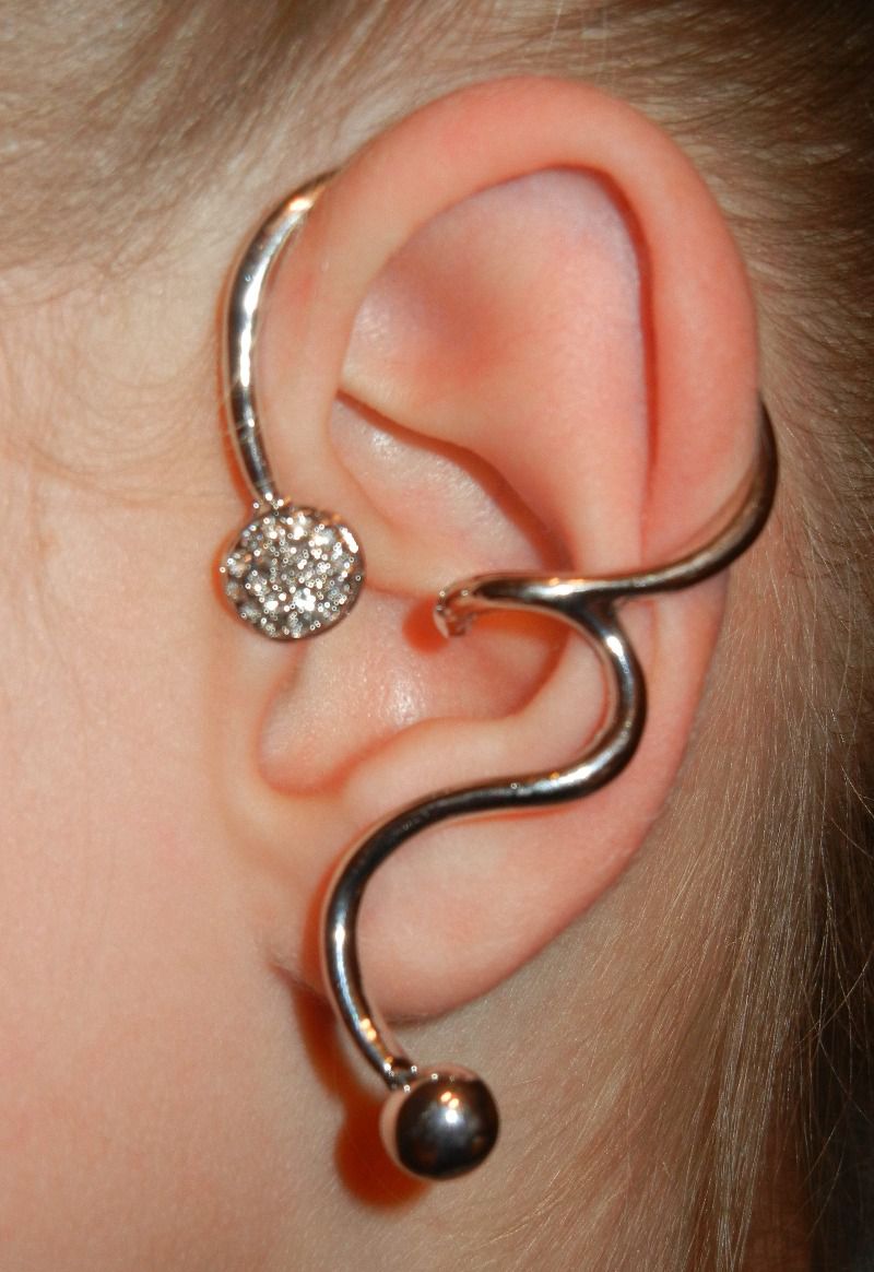 Изогнутый кафф со круглой каплей украшен мелкими стразами Представлен в двух цветах: серебристом и золотистом цветах... Для ношения нужен стандартный прокол мочки уха.