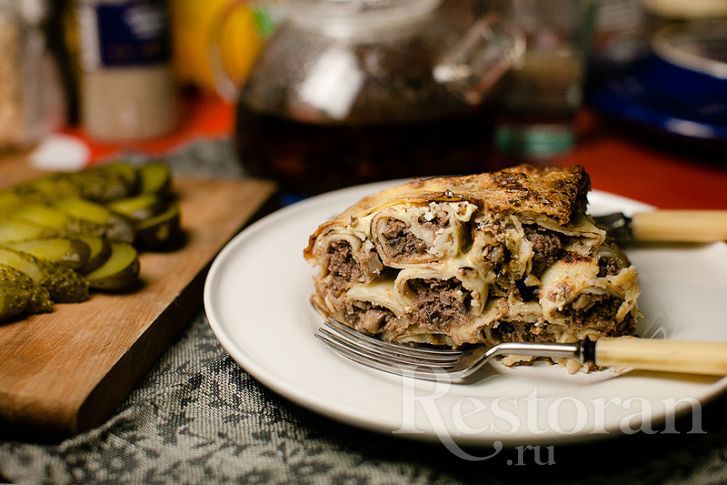 Рецепт блинного пирога с мясом и грибами Restoran.ru
