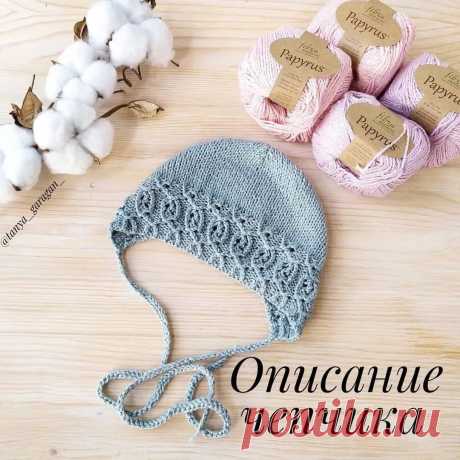 Чепчик спицами Автор описания: garagan_knitТекст автора:Размер 40-42Спицы 2,5.Пряжа fibra natura papyrus.Моя плотность 10/1024 петли / 32 рядаРаппорт 6 петель. в 3,5,13 и 15 ряду обвитие четырех петель.Я набирала 72 петли.Раппорт 6 петель*11 + 2 кромочные, 1 лиц. скрещенной после кромочной в начале + 3...