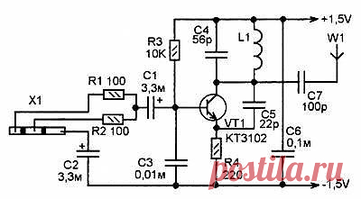 Передатчик для МП-плеера. Подключаете плеер к передатчику, а слушаете на любой тюнер или радиоприемник, качество передачи великолепное.