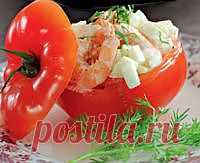 Из помидор вынимаем всю мякоть и перегородки, мелко измельчаем.В миске перемешиваем яблоки, креветки, внутренности из помидор