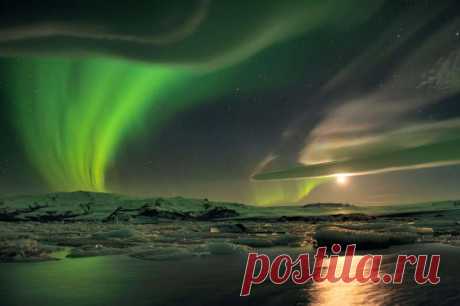 Что происходит на небе? На снимке запечатлена холодная зимняя ночь в Исландии. На дальнем фоне находится самый большой ледник в Исландии: Ватнайёкюдль. Около левого края картинки кажется, что яркое зеленое северное сияние истекает из ледника, как будто это вулкан. Северное сияние отражается в озере Ёкюльсаурлоун. Около правого края видно длинное необычное линзовидное облако, окрашенное в зеленый цвет свечением другого северного сияния позади него.