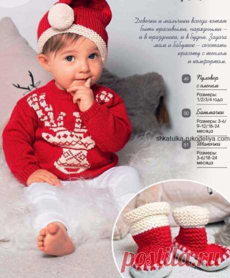 Детский пуловер с жаккардовым узором олень Детский пуловер с жаккардовым узором олень спицами. Детский комплект пуловер, башмачки и шапочка с мотивом «олень». Вязание для детей. Размеры: 1 (2, 4) 6(8) 10(12) 14(16) лет Вам потребуется: пряжа (50% овечьей шерсти, 50% хлопка; 55 м/ 50 г) - 150 (200) 200 (250) 250 (350) г меланжевой, спицы No 7, 6 пуговиц. Узоры и схемы: Резинка: попеременно 1 лицевая, 1 изнаночная. Лицевая гладь: лицевые ряды - лицевые п., изнаночные ряды - изнаночные п. Жаккард…
