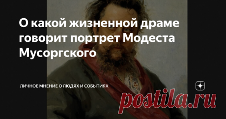 О какой жизненной драме говорит портрет Модеста Мусоргского Знаменитый портрет композитора Модеста Мусоргского, написанный Ильей Репиным, знаком с детства. Перед зрителем предстает образ взлохмаченного мужчины с одутловатым лицом, в халате, но с острым и умным взглядом. Почему именно в таком виде художник изобразил великого композитора? Неужели нельзя было хотя бы причесать человека перед позированием? Но