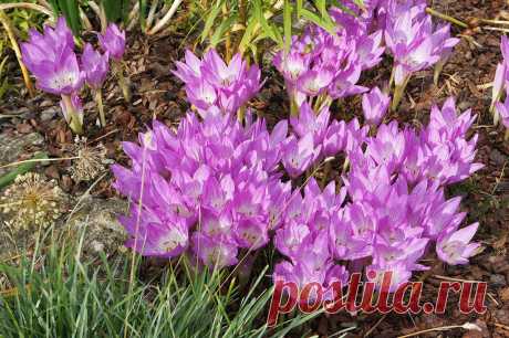 Многолетний садовый цветок Безвременник (Сolchicum). Клубнелуковичный многолетник высотой 10-11 см с прикорневыми листьями. Цветки крупные розовато-фиолетовые, белые. Цветет ранней весной или осенью.