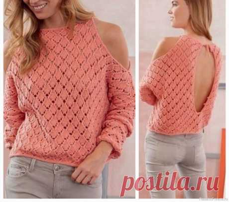 Ажурный свитер с вырезами на плечах и спинке. Описание | Вязание для женщин спицами. Схемы вязания спицами XS — S — M — L — XL. Материалы пряжа Schachenmayr Soft & Easy (100% полиакрил, 100 г/235 м) 4-4-5-5-6 мотков; спицы круговые 4 мм и спицы чулочные 4 мм; крючок 4 мм.