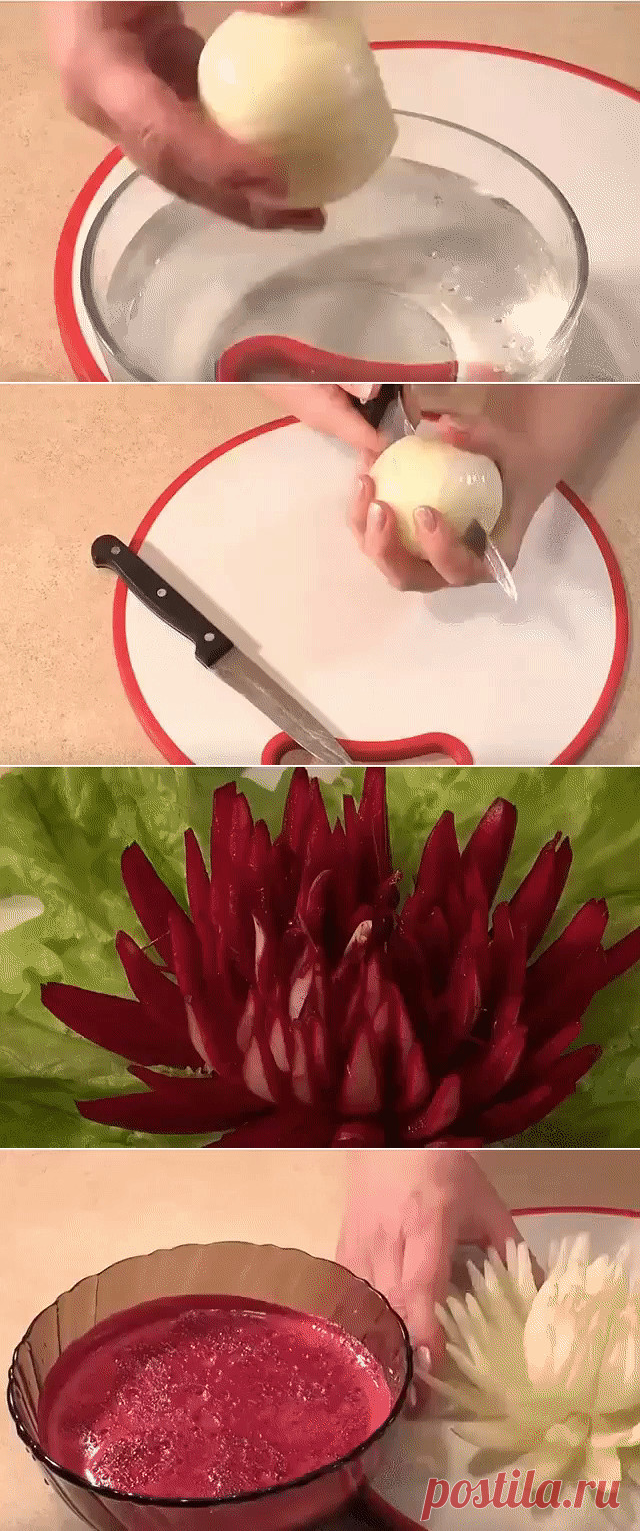 разрезанную луковицу опустить в ледяную воду на 30 минут......а затем в свёкольный сок на 20-30 мин.(чем дольше тем краснее)